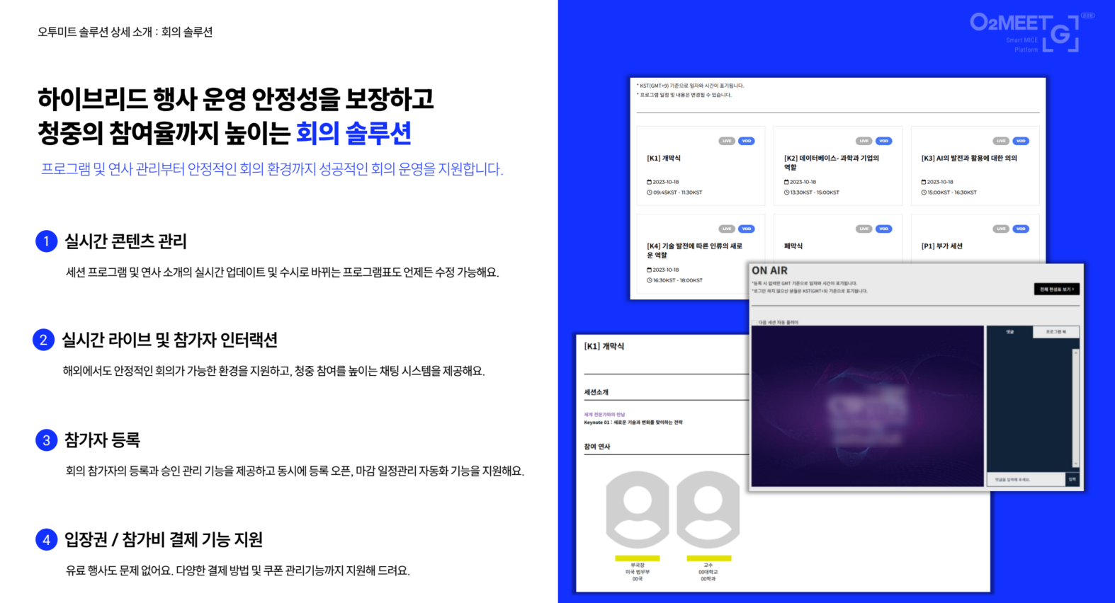 세션및발표자관리, 발표자료온라인공유, 하이브리드회의, 모바일참여형회의플랫폼,SaaS기반회의자동화, 회의솔루션, 온라인회의, 라이브스트리밍
