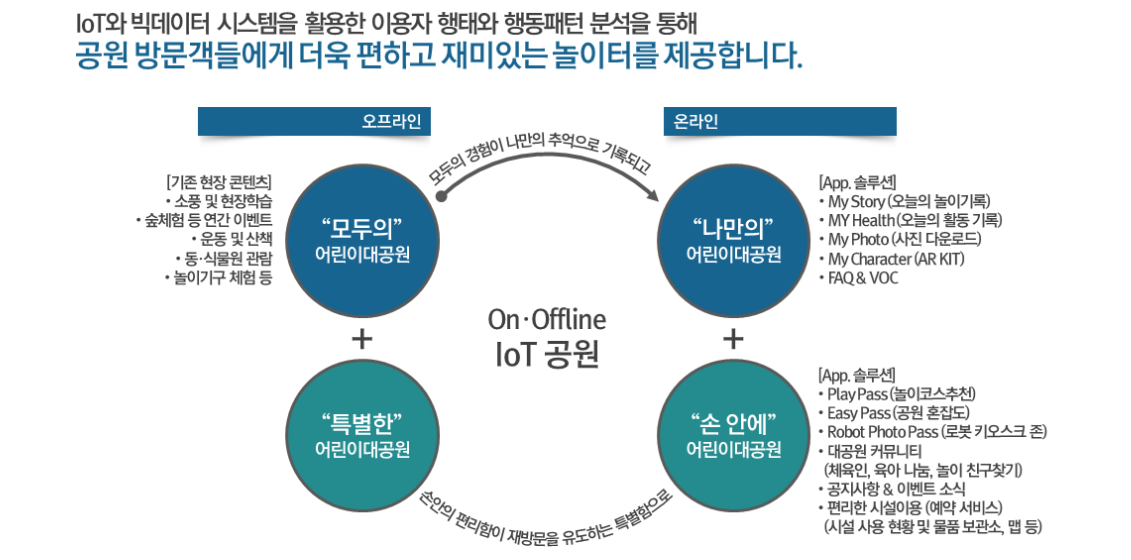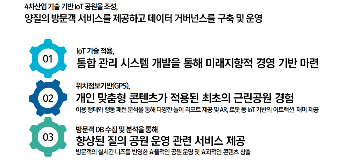 ① 공원 내 시설물, 콘텐츠, 방문객 데이터를 IoT 센서와 모바일 앱을 통해 실시간으로 수집·분석하여, 이용자 맞춤형 체험 서비스와 운영 효율화를 동시에 제공합니다.