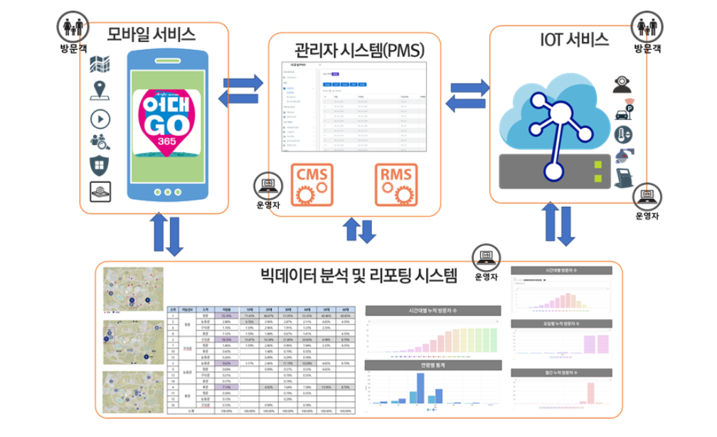 - 앱을 통해 수집된 위치·이동·체류 데이터와 IoT 센서 정보를 통합 분석하여 방문객의 이용패턴, 인기시설, 시간대별 혼잡도 등을 시각화합니다.