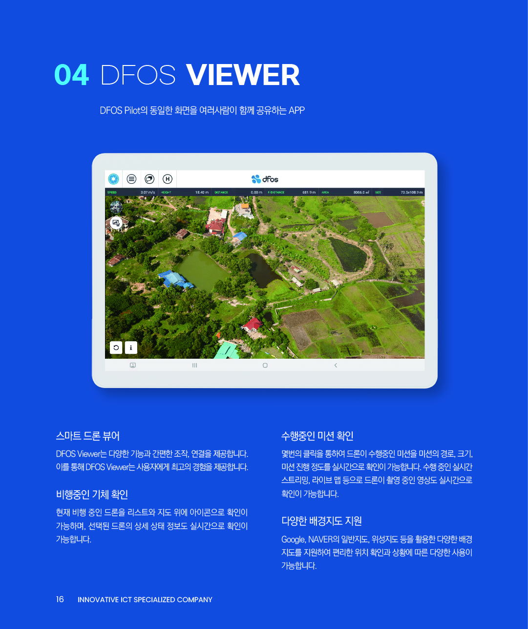 - 드론 관제, 영상 촬영, 실시간 영상 공유, 정사영상 서비스, 3D 모델링 서비스, 파노라마 자동 제작, 파노라마 시계열 조회, 공간정보 입력, 데이터 공유