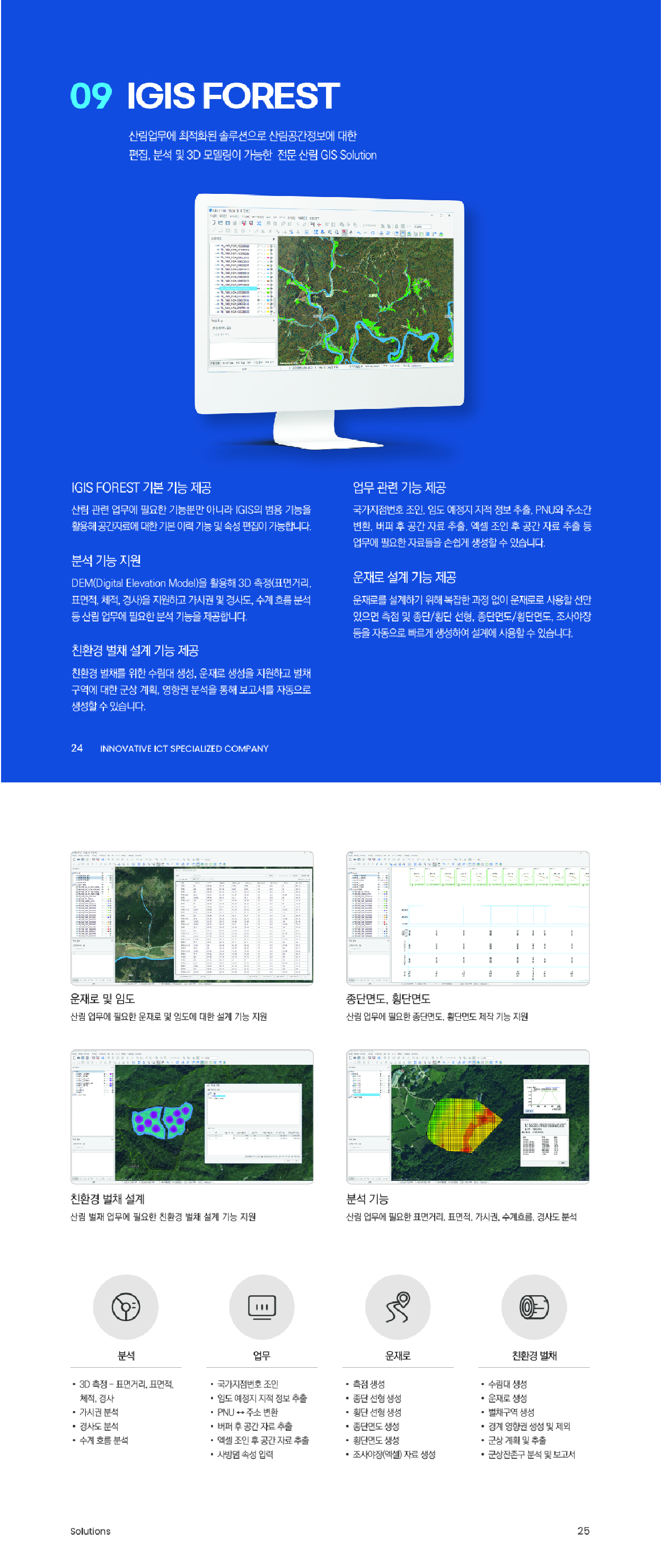 - 친환경 벌채를 위한 수림대 생성, 운재로 생성을 지원하고 벌채 구역에 대한 군상 계획, 영향권 분석을 통해 보고서 자동 생성