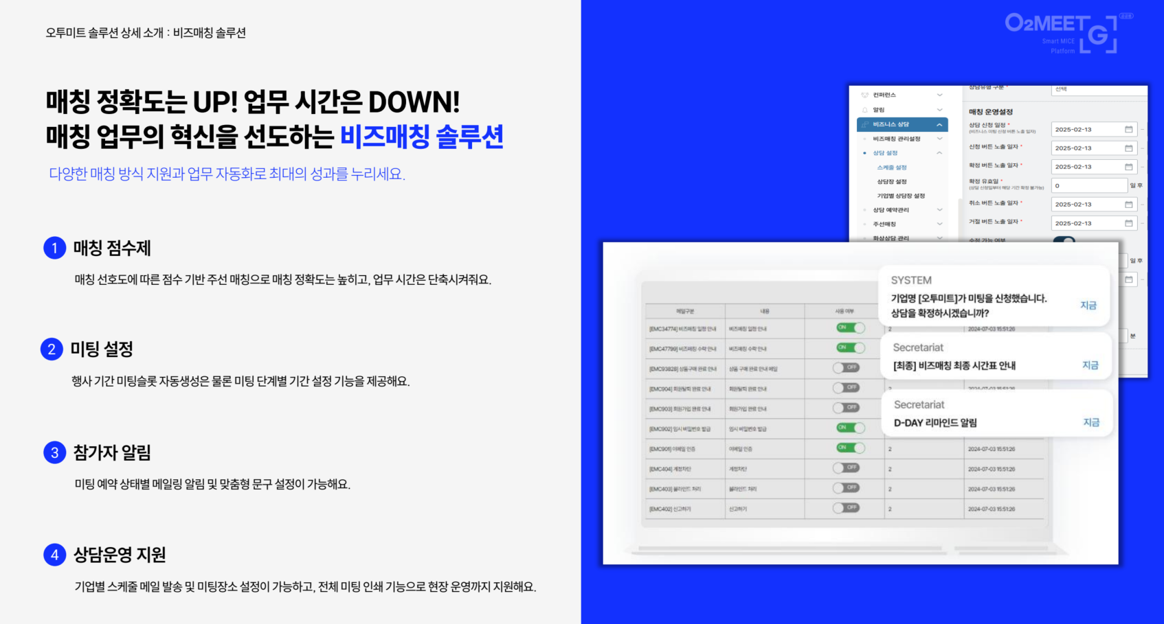 ‘오투미트 비즈매칭 솔루션’은 공공기관, 지자체, 전시·박람회 주최기관이 참가자·기업 간 비즈니스 상담과 네트워킹을 효율적으로 운영할 수 있도록 지원하는 매칭 솔루션입니다.